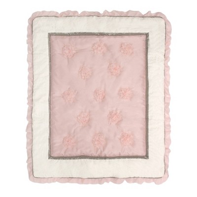 The Peanut Shell Arianna: This 5 piece crib set features an array of opulent fabrics, such as pink and gray taffeta, white embroidered sateen, pink chiffon, and a beautiful rosette taffeta.